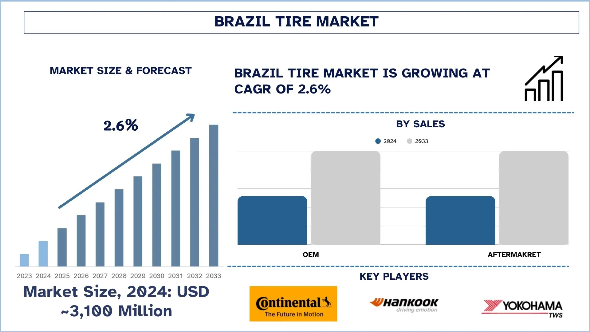 ·      The demand for personal cars among the middle-class population in Brazil is one of the key drivers for the market growth of tires. With the rising per capita income, the aspiration of owning a car is becoming prevalent among the middle and lower-middle-class population. Additionally, the growing network of roads, along with the car culture, has also promoted long tours as well as intercity travel. Aligning with this, the demand for aftermarket/replacement tires is also surging in the country.
