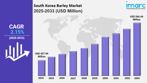 The South Korea barley market was valued at USD 457.90 Million in 2024. Looking forward, IMARC Group estimates the market to reach USD 566.44 Million by 2033, exhibiting a (CAGR) of 2.15% from 2025-2033.