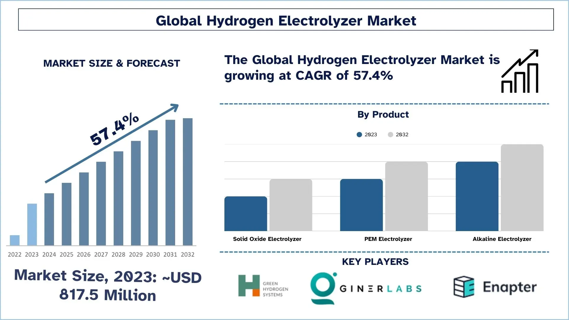 The Hydrogen Electrolyzer Market was valued at USD 817.5 million and is expected to grow at a strong CAGR of around 57.4% during the forecast period (2024-2032), owing to investment in green hydrogen production.