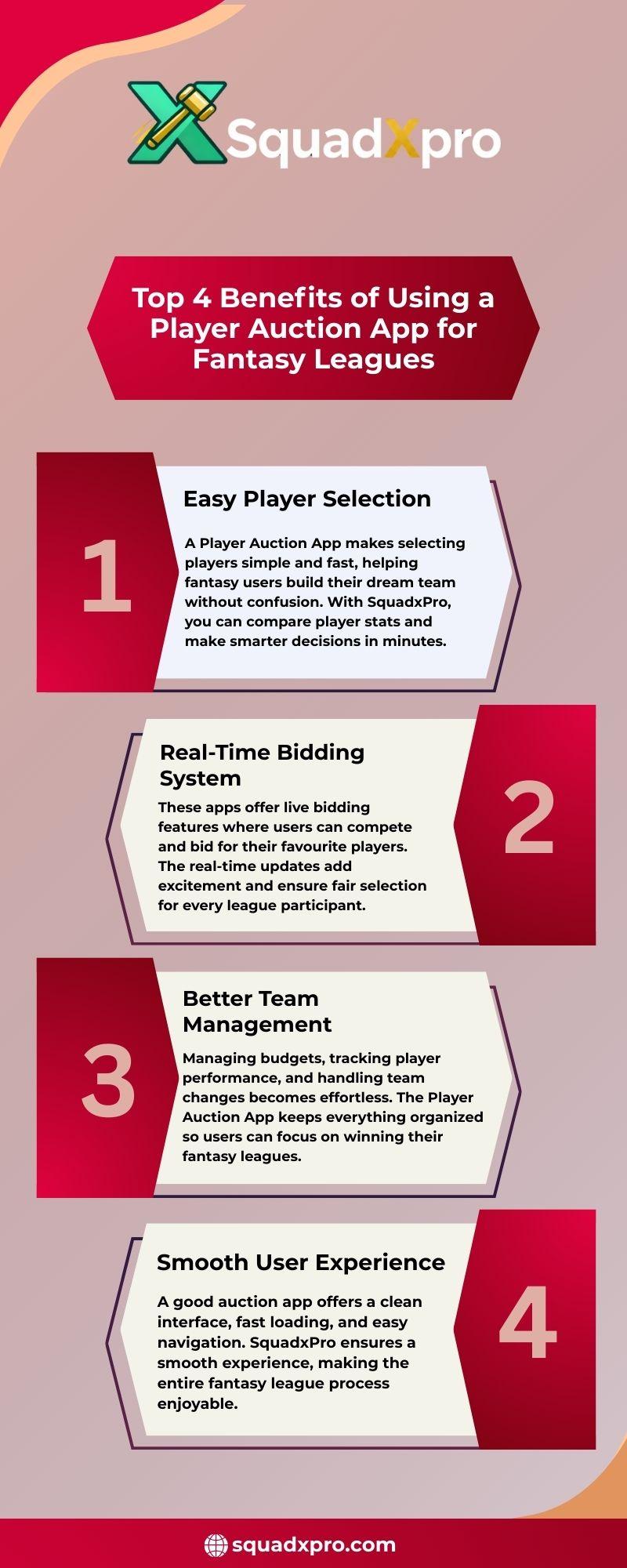 Visit Here - https://squadxpro.com/Top 4 Benefits of Using a Player Auction App for Fantasy Leagues 1. Easy Player Selection A Player Auction App makes selecting players simple and fast, helping fantasy users build their dream team without confusion. With SquadxPro, you can compare player stats and make smarter decisions in minutes. 2. Real-Time Bidding System These apps offer live bidding features where users can compete and bid for their favourite players. The real-time updates add excitement and ensure fair selection for every league participant. 3. Better Team Management Managing budgets, tracking player performance, and handling team changes becomes effortless. The Player Auction App keeps everything organized so users can focus on winning their fantasy leagues. 4. Smooth User Experience A good auction app offers a clean interface, fast loading, and easy navigation. SquadxPro ensures a smooth experience, making the entire fantasy league process enjoyable. Visit Here - https://squadxpro.com/0 Commenti 0 condivisioni 31 Views 0 AnteprimaEffettua l'accesso per mettere mi piace, condividere e commentare! -